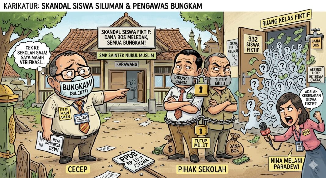 Meski telah menginjakkan kaki di SMKS Saintek Nurul Muslim guna menelusuri dugaan kurang lebih 332 siswa fiktif, Pengawas SMK Dinas Pendidikan setempat, Cecep, seolah enggan membuka kotak pandora hasil temuannya ke publik…Cecep malah mengarahkan kembali awak media untuk menanyakan langsung hasilnya ke sekolah.