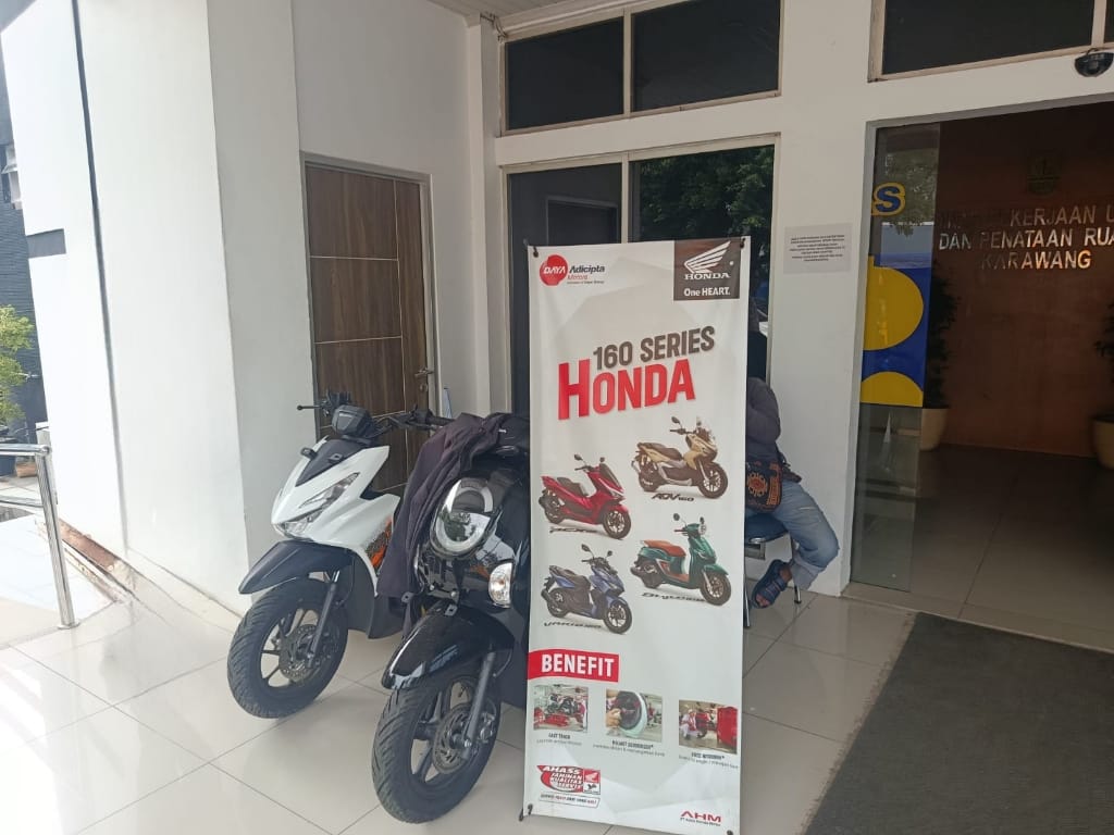 Di Kantor Dinas Pekerjaan Umum dan Penataan Ruang (PUPR) Kabupaten Karawang, teras yang seharusnya steril dari aktivitas komersial justru disulap menjadi stand penjualan sepeda motor.