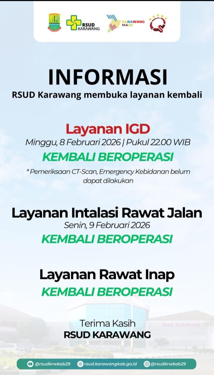 Memasuki hari keempat pascakejadian, RSUD Karawang mengumumkan bahwa layanan Instalasi Gawat Darurat (IGD) kembali dibuka dan mulai beroperasi pada Minggu (8/2/2026) pukul 22.00 WIB. Namun demikian, untuk sementara waktu layanan pemeriksaan CT-Scan dan emergency kebidanan masih belum dapat dilaksanakan karena proses penyesuaian teknis kelistrikan masih berlangsung.