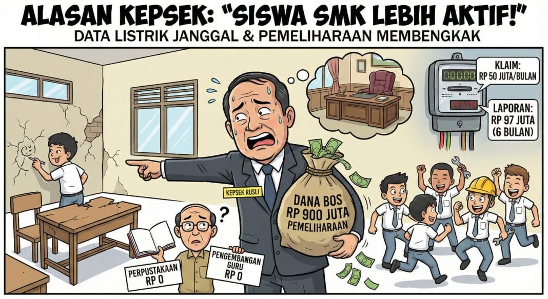 “Biaya listrik kami tidak seperti SMA biasa. Tagihan riilnya bisa mencapai Rp 50 juta per bulan. Daya kami 230.000 Watt untuk mesin praktik,” klaim Rusli saat dikonfirmasi, Rabu (17/12/25).