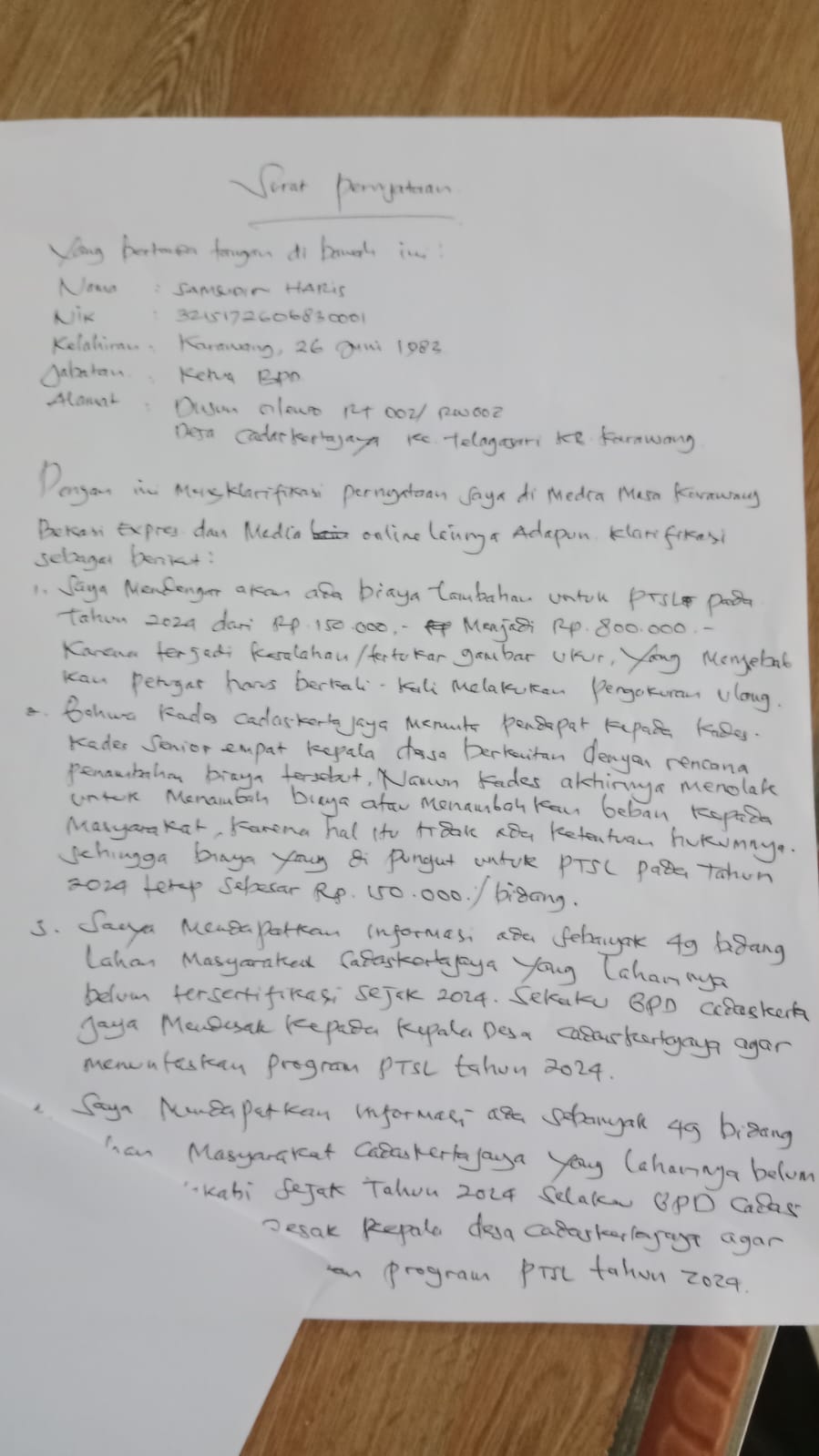 Dalam surat klarifikasinya, meskipun BPD menyatakan bahwa Kades akhirnya menolak penambahan biaya di luar ketentuan dan biaya yang dipungut tetap Rp150.000 (Poin 2), Ketua BPD (Samsudin Haris) dalam poin pertama surat tersebut justru membenarkan adanya tambahan biaya dari Rp150.000 menjadi Rp800.000 dengan alasan “terjadi kesalahan/terkait gambar ukur yang menyebabkan pihak penggar harus berkali-kali melakukan pengukuran ulang.”