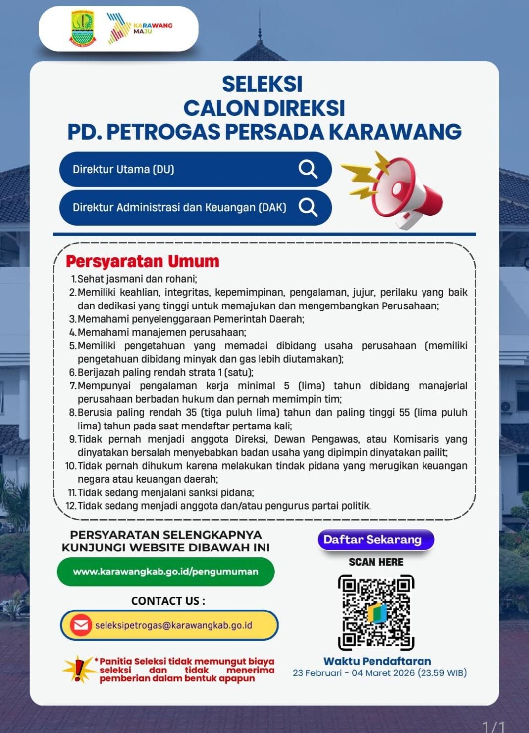 KARAWANG | ONEDIGINEWS.COM | Pemerintah Kabupaten Karawang membuka seleksi terbuka calon direksi Perusahaan Daerah (PD) Petrogas Persada Karawang Tahun 2026 untuk mengisi dua posisi strategis di perusahaan daerah sektor energi minyak dan gas tersebut.